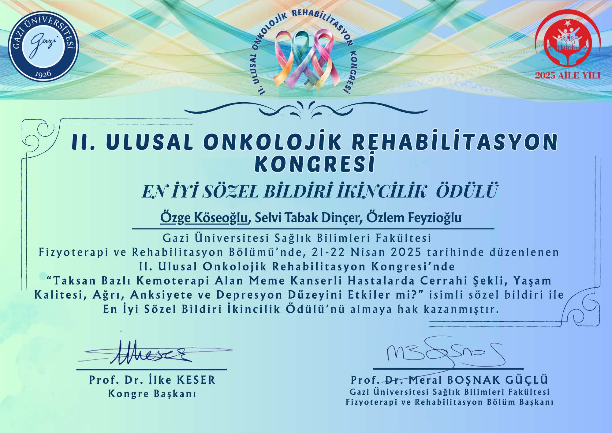 We congratulate our academics for winning second prize in the “Best Verbal Presentation” category at the 2nd National Oncological Rehabilitation Congress, held on April 21–22, 2025, at Gazi University Faculty of Health Sciences, Department of Physiotherapy and Rehabilitation. Their study, titled “Does the Type of Surgery Affect Quality of Life, Anxiety, and Depression Levels in Breast Cancer Patients Receiving Taxane-Based Chemotherapy?” was presented during the congress.