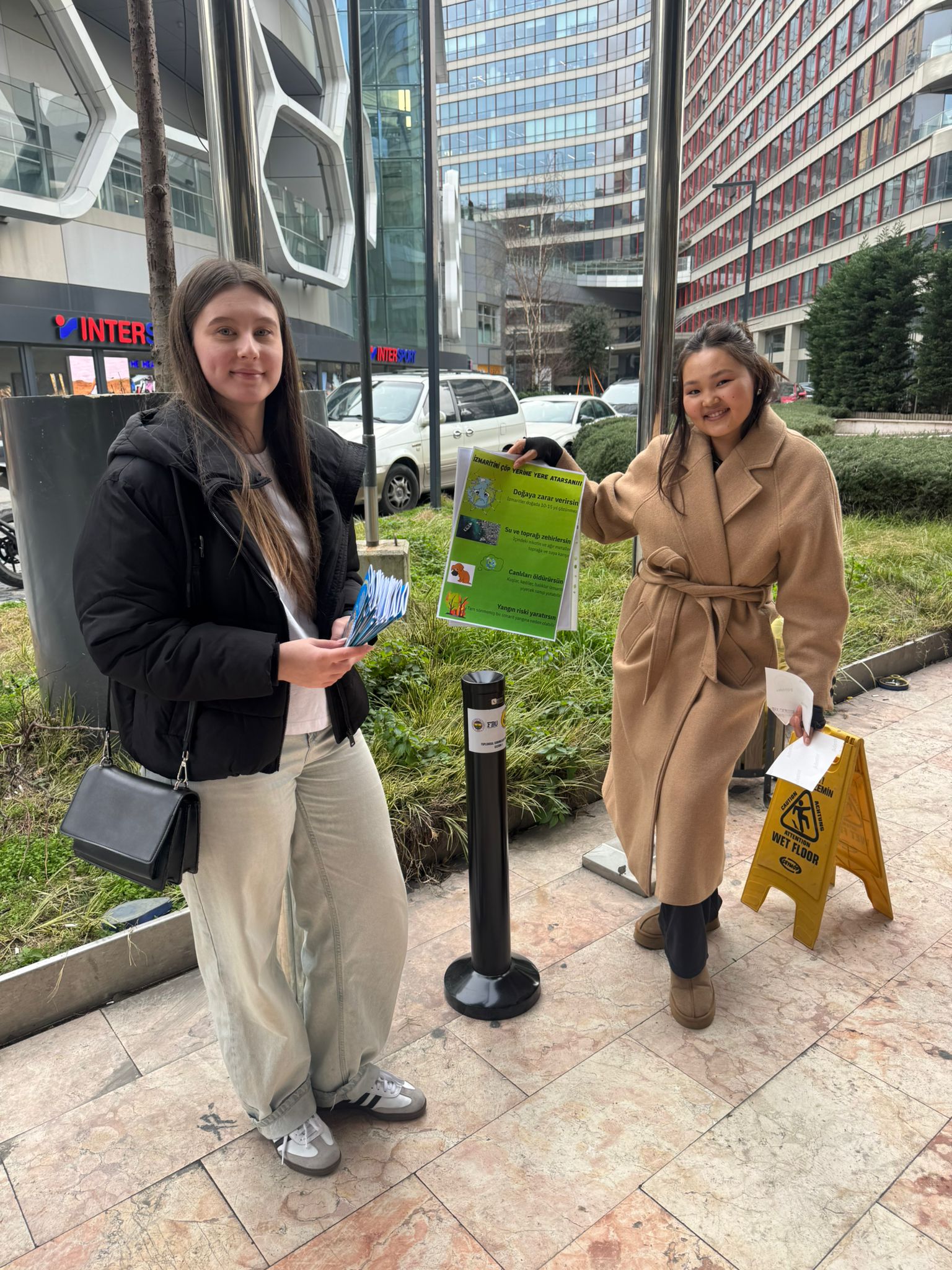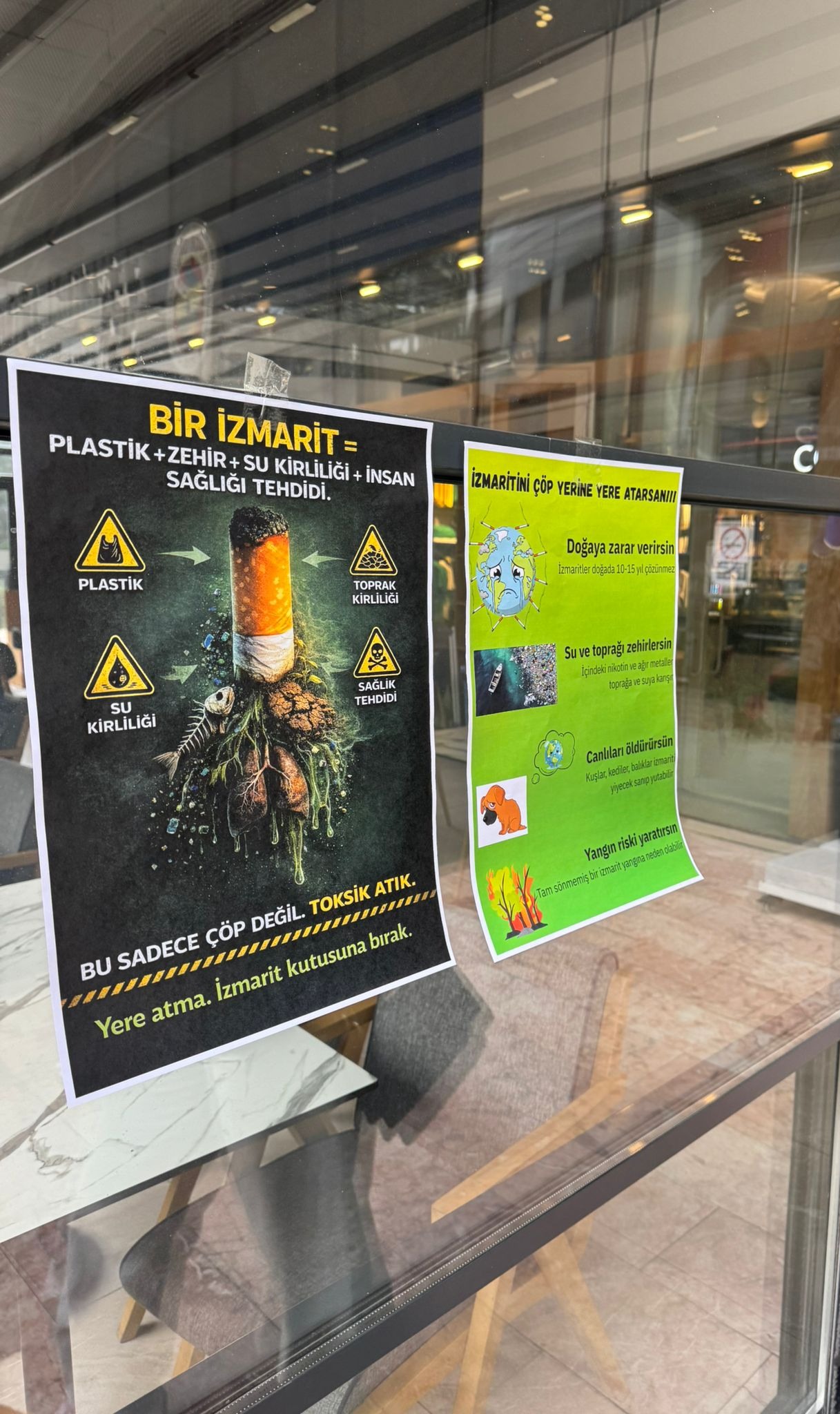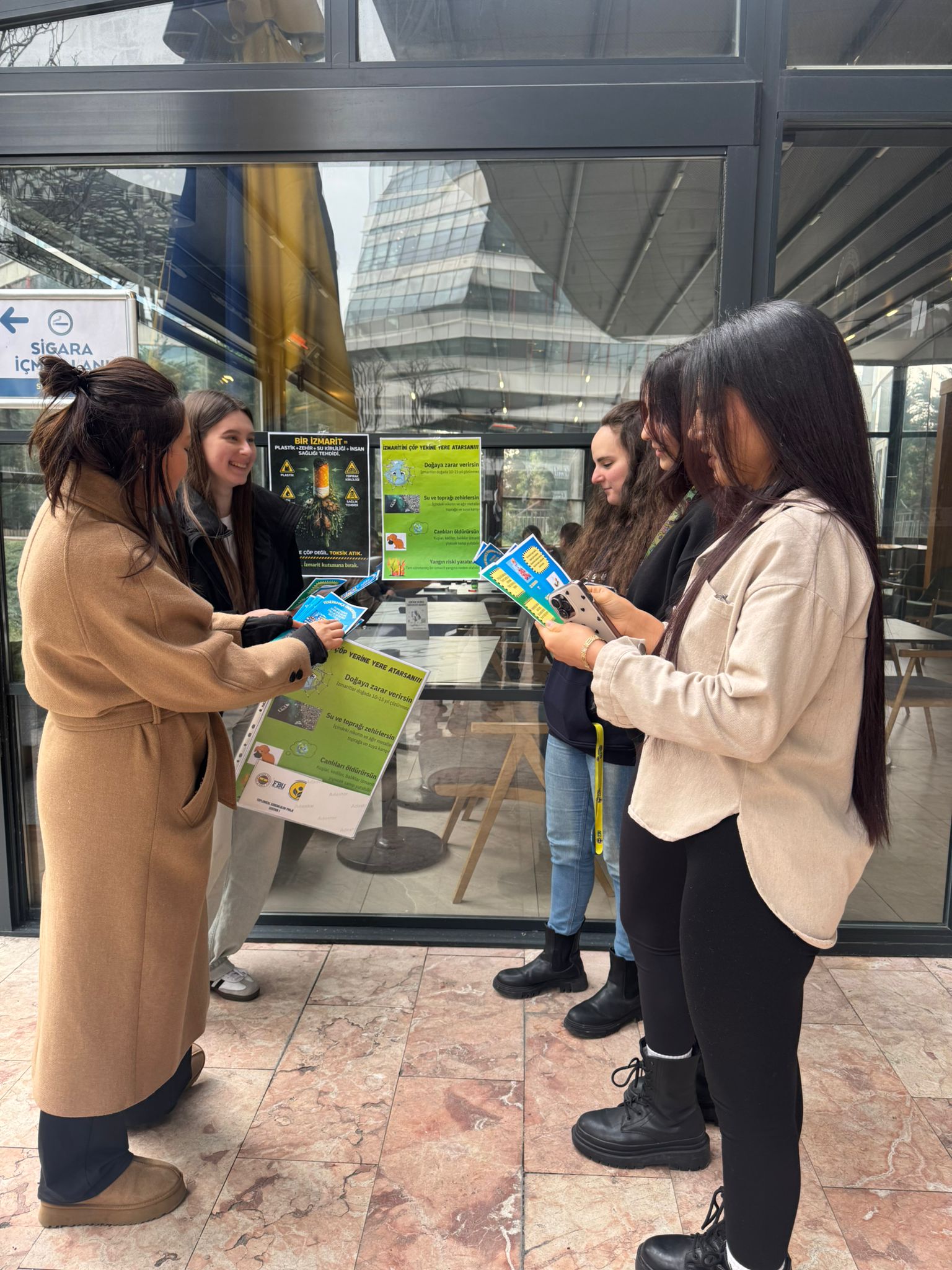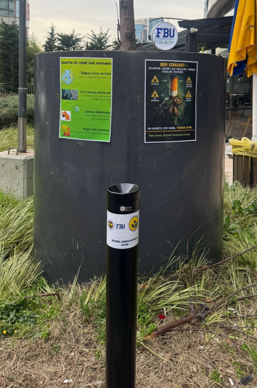 Launched with the slogan “Small Ashes, Big Costs”, the project placed cigarette butt collection boxes at the entrances of the university blocks F and B to reduce the environmental damage caused by cigarette waste. In addition to these physical measures, students distributed informative brochures across campus explaining the decomposition time of cigarette butts in nature and their environmental impact to raise awareness. Eye-catching posters displayed in smoking areas reiterated the call to “leave no trace.”