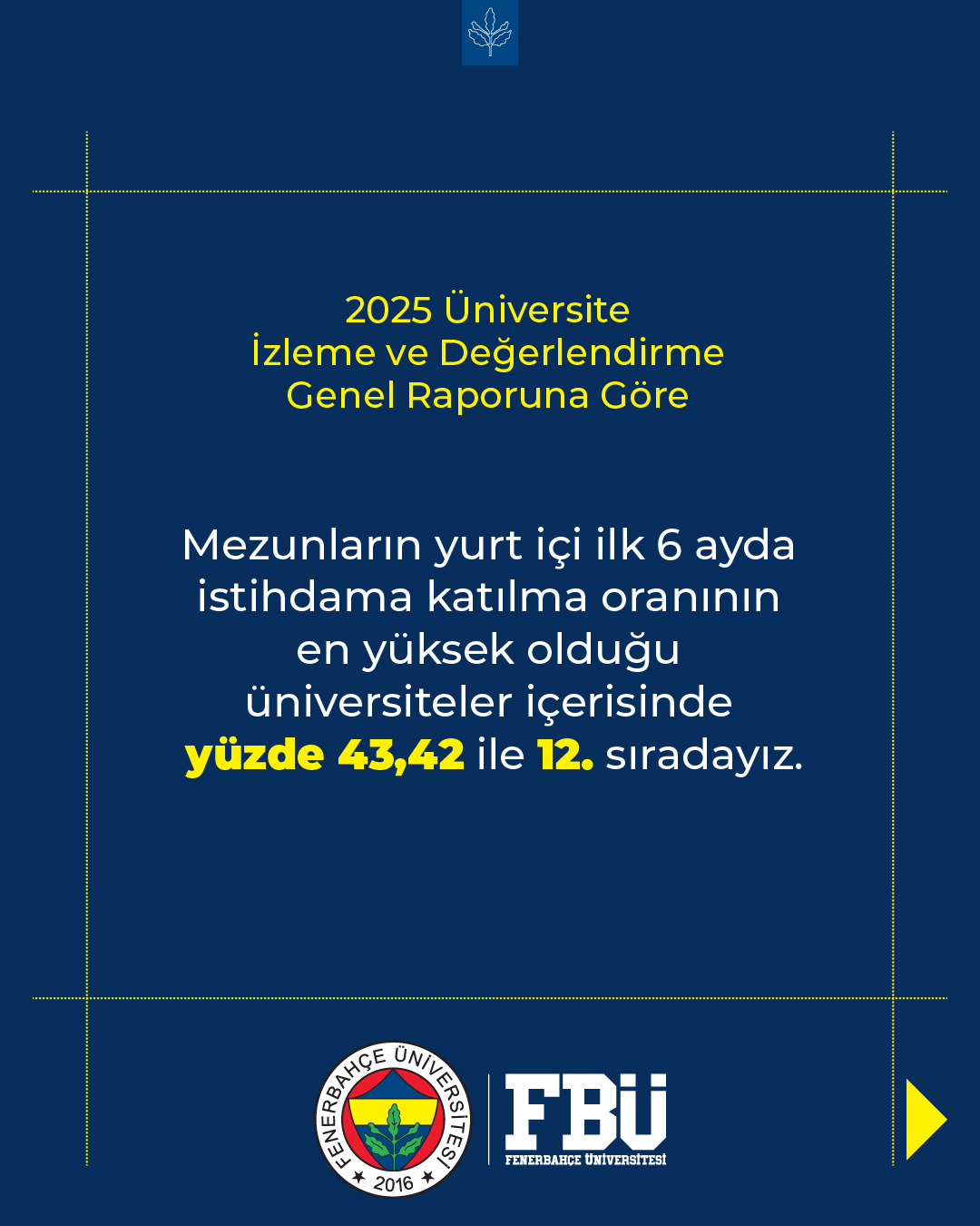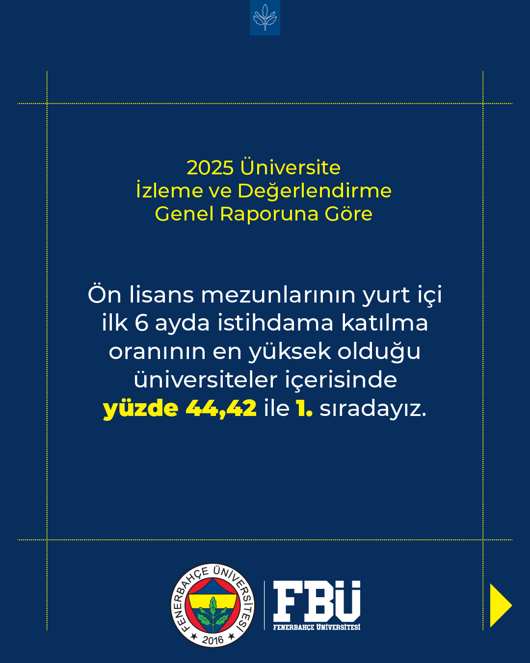 2025 Üniversite İzleme ve Değerlendirme Genel Rapor verilere göre Fenerbahçe Üniversitesi ön lisans mezunlarının yurt içi ilk 6 ayda istihdama katılma oranının en yüksek olduğu üniversiteler içerisinde yüzde 44,42 ile 1. sırada yer aldı.