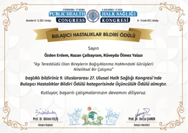 10–13 Aralık 2025 tarihlerinde Antalya’da düzenlenen 9. Uluslararası 27. Ulusal Halk Sağlığı Kongresi’nde, Fenerbahçe Üniversitesi Sağlık Bilimleri Fakültesi Ebelik Bölümü'nden Dr. Öğr. Üyesi Rüveyda Ölmez Yalazı’nın yer aldığı “Aşı Tereddüdü Olan Bireylerin Bağışıklanma Hakkındaki Görüşleri: Niteliksel Bir Çalışma” başlıklı bildiri, Bulaşıcı Hastalıklar Bildiri Ödülü kategorisinde üçüncülük ödülüne layık görüldü.