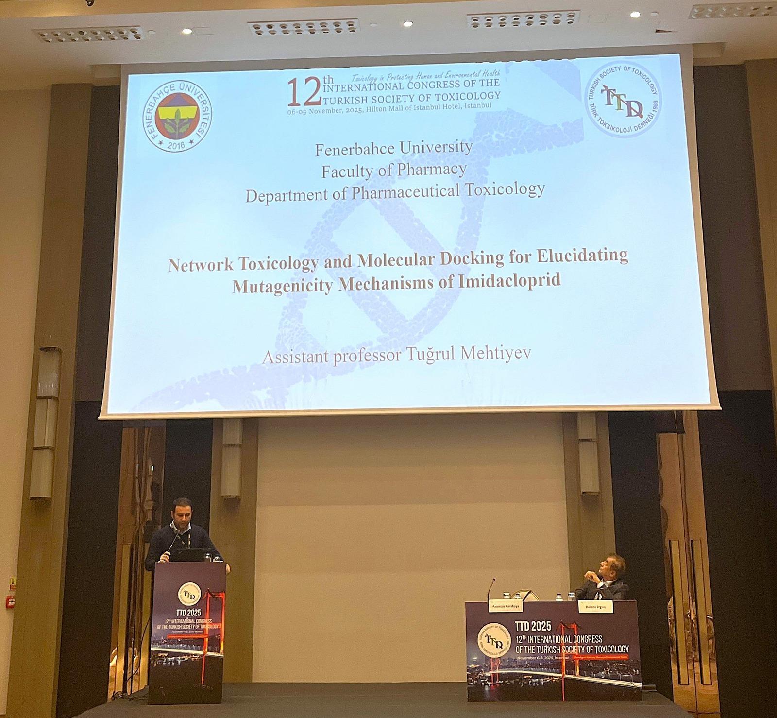 Prof. Dr. Türkan YURDUN, 8 Kasım 2025 tarihinde gerçekleşen “Therapeutic Agents and Natural Products” oturumunda oturum başkanlığı görevini üstlendi. Dr. Öğr. Üyesi Tuğrul MEHTİYEV ise kongrede “Network Toxicology and Molecular Docking for Elucidating Mutagenicity Mechanisms of Imidacloprid” başlıklı çalışmasını sunarak, pestisit kaynaklı mutajenite mekanizmalarının aydınlatılmasında ağ toksikolojisi ve moleküler doking yaklaşımlarının önemini vurguladı.