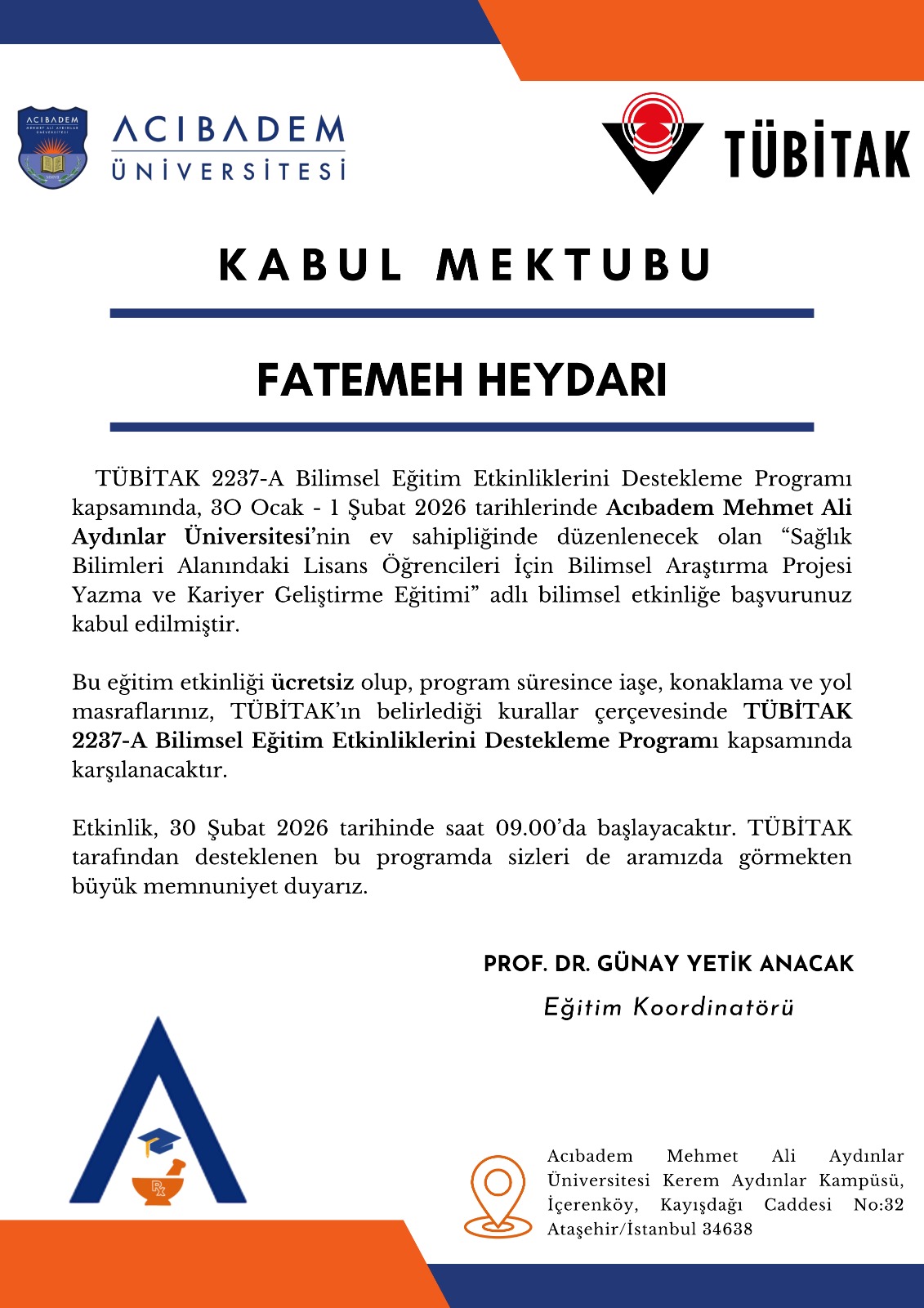 Eczacılık programı 4. sınıf öğrencisi Fatemeh Heydari, TÜBİTAK 2237-A Bilimsel Eğitim Etkinliklerini Destekleme Programı kapsamında gerçekleştirileşecek bir eğitime kabul aldı. Öğrencimiz, 30 Ocak – 1 Şubat 2026 tarihleri arasında Acıbadem Mehmet Ali Aydınlar Üniversitesi ev sahipliğinde düzenlenecek olan 'Sağlık Bilimleri Alanındaki Lisans Öğrencileri İçin Bilimsel Araştırma Projesi Yazma ve Kariyer Geliştirme Eğitimi' adlı bilimsel etkinliğe katılım hakkı kazanmıştır.