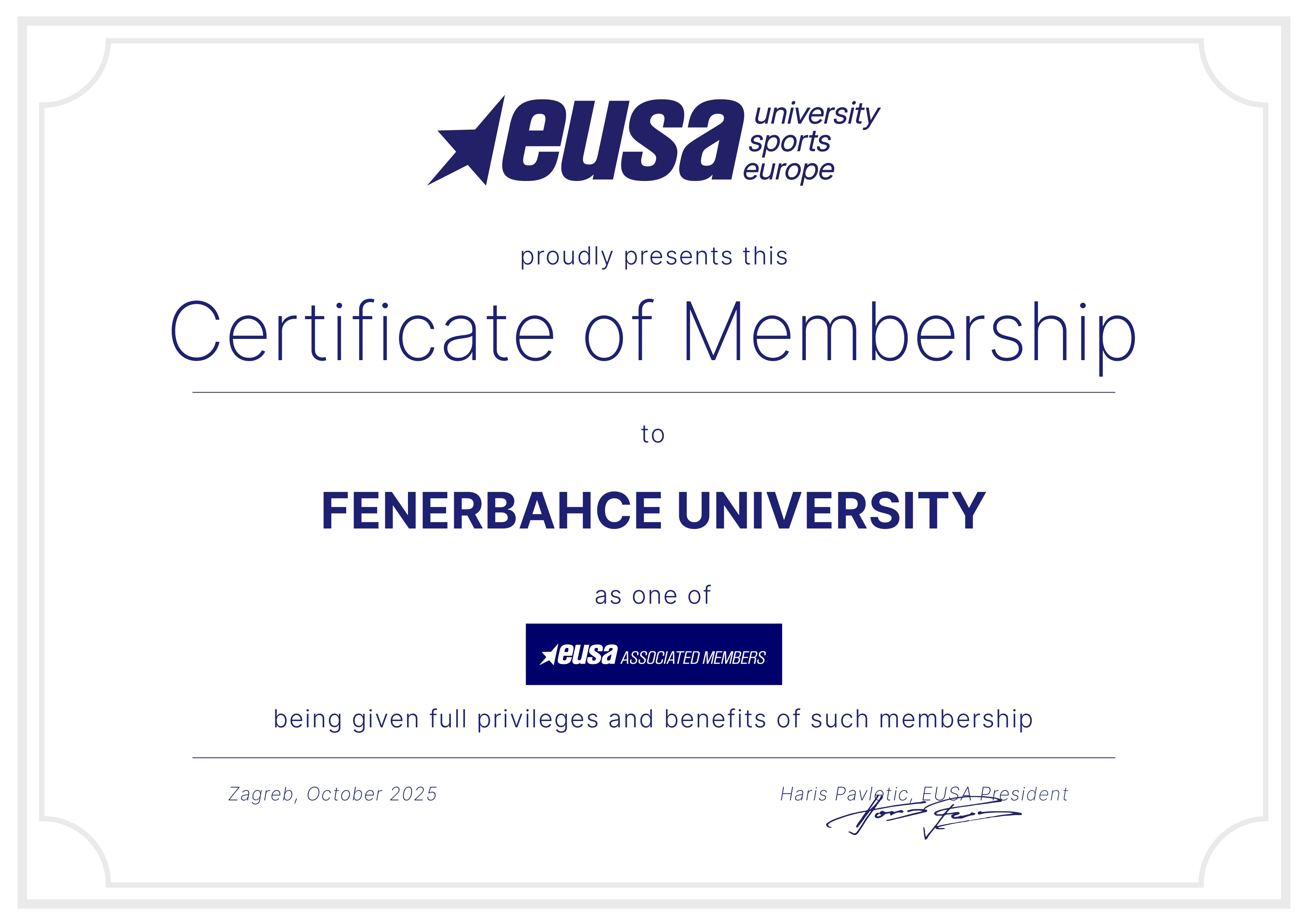 Fenerbahçe Üniversitesi, Avrupa Üniversite Sporları Birliği (EUSA) tarafından “EUSA Associated Member” statüsüne kabul edilmiştir. EUSA Yürütme Komitesi tarafından yapılan değerlendirme sonucunda üniversitemizin başvurusu olumlu bulunmuş ve 10 Ekim 2025 tarihinde gerçekleştirilen genel kurul toplantısında üyelik onaylanmıştır. Fenerbahçe Üniversitesi olarak bu önemli gelişmenin üniversitemizin uluslararası spor yapılanmasına katkı sağlayacağına inanıyor, EUSA ile yürütülecek çalışmaların yeni iş birliklerine zemin oluşturmasını diliyoruz.