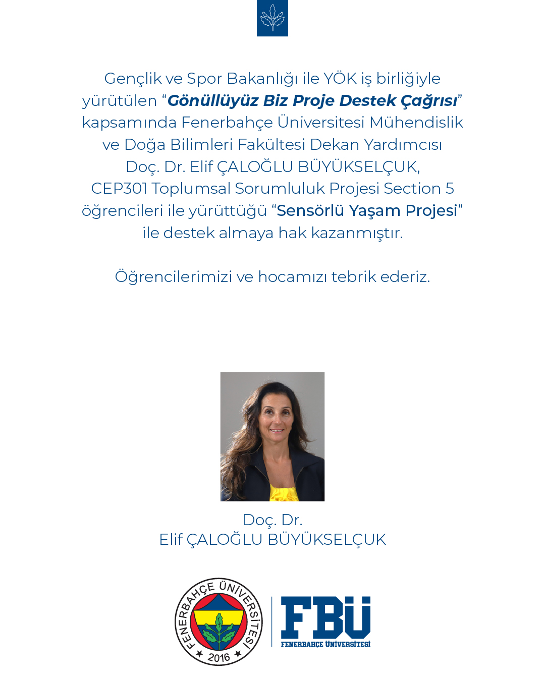 Fenerbahçe Üniversitesi Mühendislik ve Doğa Bilimleri Fakültesi Dekan Yardımcısı Doç. Dr. Elif Çaloğlu Büyükselçuk tarafından, Hemşirelik Bölümü 3. ve 4. sınıf öğrencileriyle birlikte yürütülen “Sensörlü Yaşam Projesi”, “Gönüllüyüz Biz” çağrısı kapsamında destek almaya hak kazanmıştır. Proje, Ataşehir ilçesinde yaşayan 19 yaş üstü Tip 1 diyabetli bireylerin sürekli glikoz ölçüm sensörlerine erişiminin artırılmasını hedeflemektedir. Sensör kullanımına yönelik farkındalık oluşturmayı, diyabet yönetiminin iyileştirilmesini ve bireylerin yaşam kalitesinin artırılmasını amaçlayan proje aynı zamanda öğrencilere sahada gönüllü çalışma deneyimi kazandırarak sağlık okuryazarlığına katkı sunmaktadır.