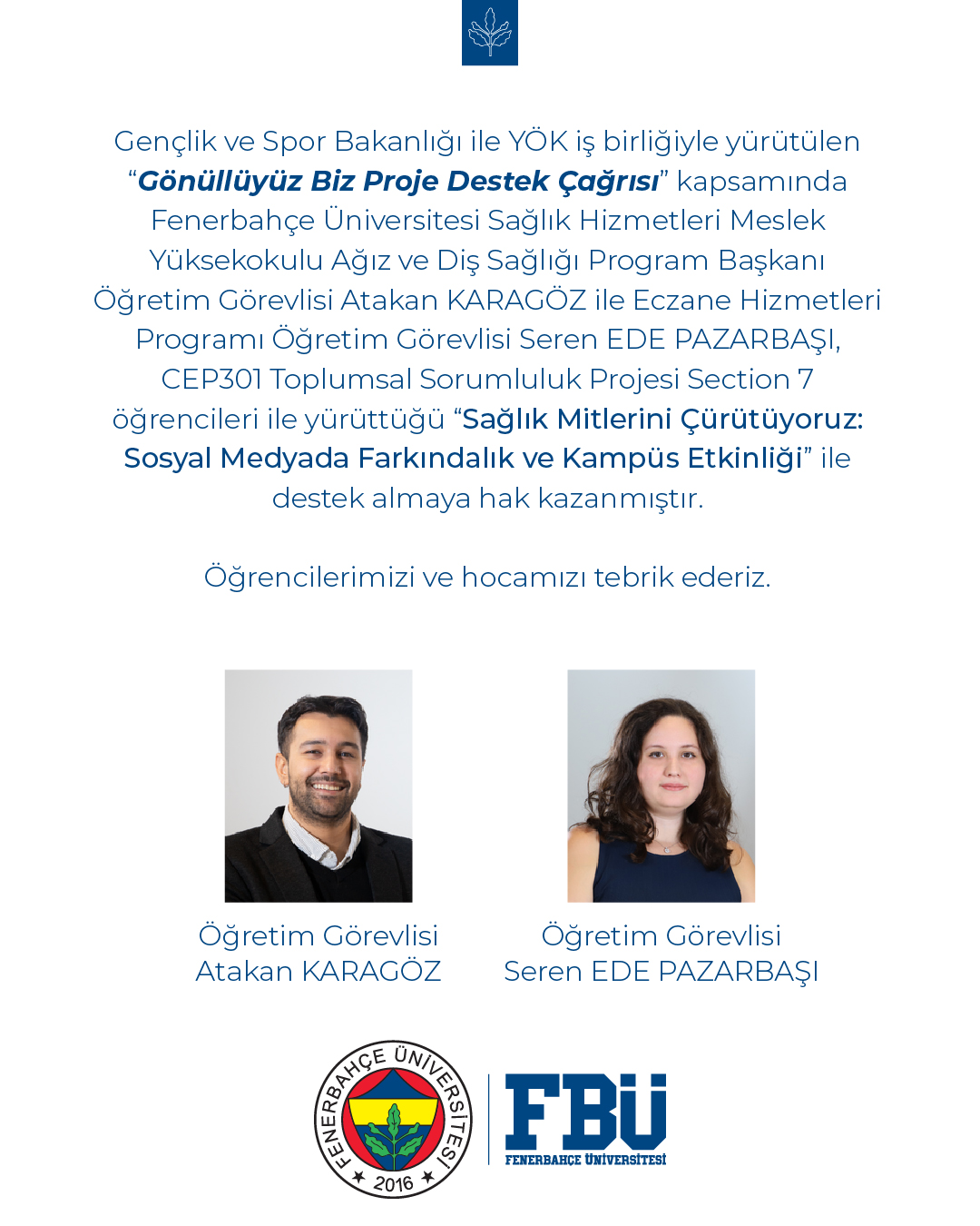 Fenerbahçe Üniversitesi Sağlık Hizmetleri Meslek Yüksekokulu Ağız ve Diş Sağlığı Program Başkanı Öğretim Görevlisi Atakan Karagöz ile Eczane Hizmetleri Programı Öğretim Görevlisi Seren Ede Pazarbaşı tarafından yürütülen “Sağlık Mitlerini Çürütüyoruz: Sosyal Medyada Farkındalık ve Kampüs Etkinliği”, “Gönüllüyüz Biz” çağrısı kapsamında destek almaya hak kazanmıştır. Proje, sağlık alanında yaygın şekilde karşılaşılan bilimsel temeli olmayan bilgi kirliliğine karşı farkındalık oluşturmayı ve toplumu doğru bilgilerle buluşturmayı amaçlamaktadır. Bu kapsamda sosyal medya aracılığıyla bilgilendirici içerikler üretilerek geniş bir kitleye ulaşılması ve kampüs ortamında düzenlenecek etkinliklerle öğrencilerin sağlık okuryazarlığının güçlendirilmesi hedeflenmektedir.