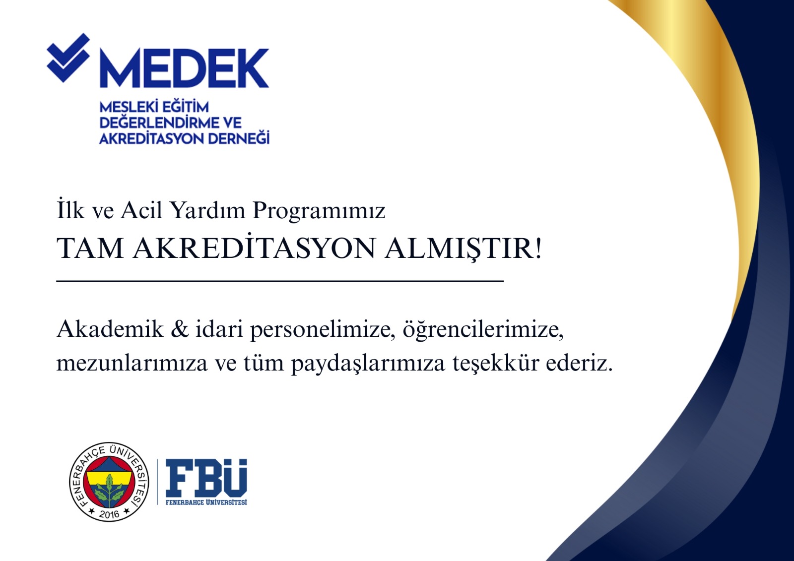 Mesleki Eğitim Değerlendirme ve Akreditasyon Derneği (MEDEK) Değerlendirme Takımının 30 Ekim- 1 Kasım 2025 tarihlerinde gerçekleştirdiği saha ziyaretinin sonucu açıklandı. Ziyaret kapsamında değerlendirmeye tabi tutulan İlk ve Acil Yardım programı 01.01.2026 – 31.12.2029 tarihleri arasında Tam Akreditasyon (4 yıl süreyle) almaya hak kazandı.